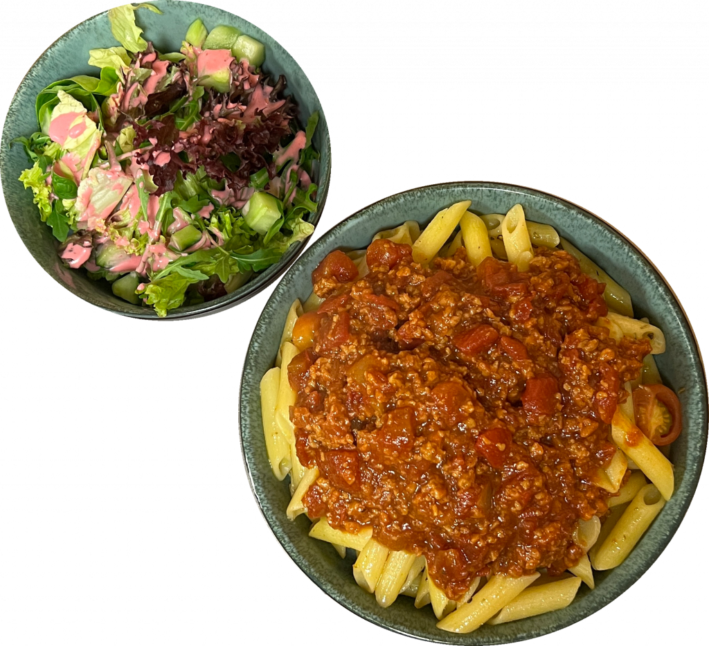 Glutenfreie Penne mit veganer Bolognese, geschmorten Cocktail-Tomaten, frischen Kräutern & dazu ein kleiner grüner Salat