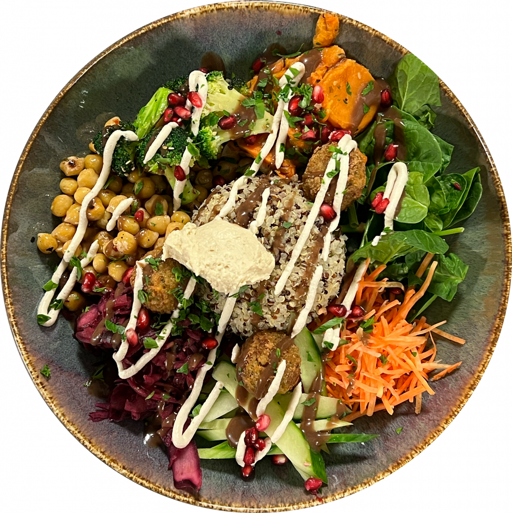 Als kalte Alternative bieten wir permanent schmackhafte Buddha Bowls, mit allerlei vitalen Lebensmitteln wie Quinoa, Bramata, Hülsenfrüchten, Nüssen und Samen, so wie knackigem Gemüse, an einem aromatischen Dressing an.